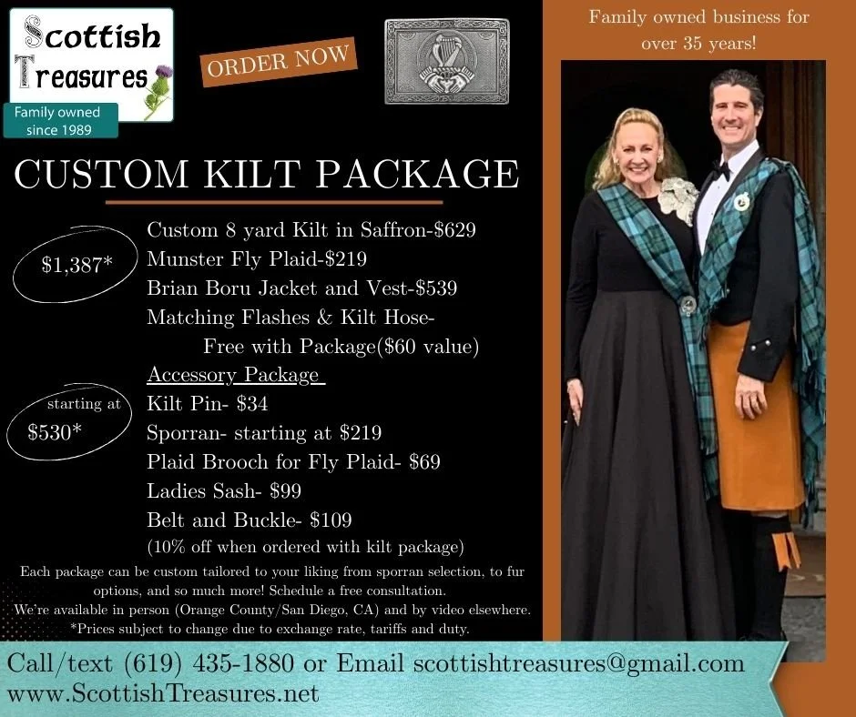 For those in North America who are interested in a formal Irish kilt, they are available from Scottish Treasures in Southern California, as can be seen in the flyer below, modelled by our own Bill and Tamara Crowley !